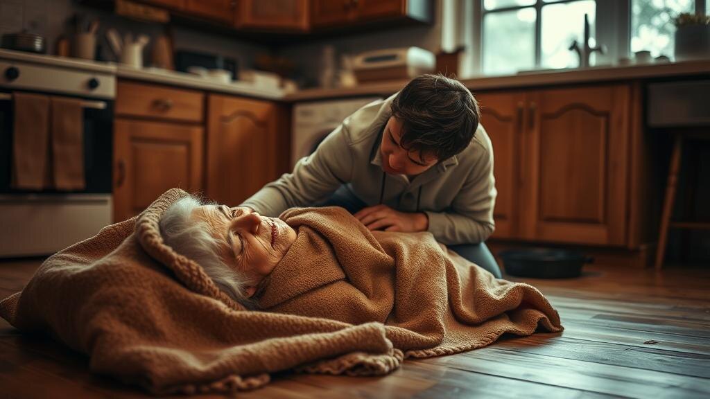 В коридоре всё ещё ощущался запах чужих духов, словно соседка только что прошла здесь. Игорь остановился, прислушиваясь: в комнате было тихо. Только когда он толкнул дверь, увидел: мать лежит на полу, прижавшись к кровати, рядом опрокинутая кружка, вода растеклась по линолеуму. Приглушённый плач матери был едва слышен — она старалась не шуметь, чтобы не звать его. Игорь бросился к ней, холод пола сразу пробрал до костей.