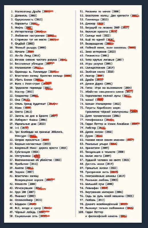 Попался в канале про кино списочек лучших фильмов XXI века по версии тг-админов) Решила отметить, что смотрела… Радует, что больше половины фильмов видела, вторая половина — в вотч-листе Печалит, что какие-то картины не помню совсем 🥲 Будет чем заняться после проекта, получается 🥰 Делитесь, что из списка видели, а что, как и я, планируете посмотреть 🙌🏻
