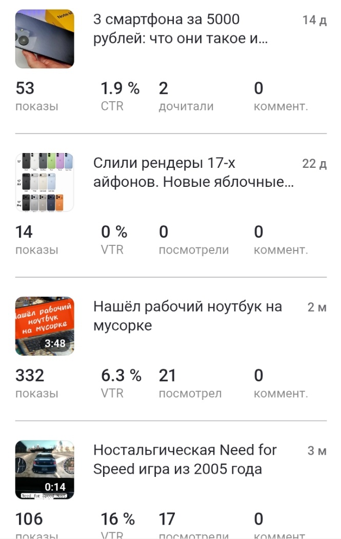 Вот уже второй год веду данный канал на энтузиазме и интересе: когда же всезнающий алгоритм Дзен вернёт показы моему Каналу. Да, с показами в количестве от 15 до 50 особо много денег не получить А в 2023 году показатели были намного выше. Так, статьи про ноутбуки и обзоры мобилок получали вполне вменяемые показы и давали хоть какой-то доход. Затем что-то случилось, дзен убрал показы и мой канал стал незаметным для подписчиков Новые публикации видят 5-6 человек, единственный момент - поисковый трафик - люди читают мои старые статьи про айфоны и отзыв на работу оператора МТС У меня есть версия, почему так случилось. Статья про критику МТС стала набирать много прочиток и гневные комментарии от абонентов этой компании. Видимо, МТС пожаловалась на мой канал и ему убрали показы. Либо есть другая версия. Рано или поздно многие старые каналы на этой платформе теряют показы и благоволение алгоритма. Иначе на всех денег не напасешься, а спонсоров у Дзена не так чтоб много. И крупные Каналы