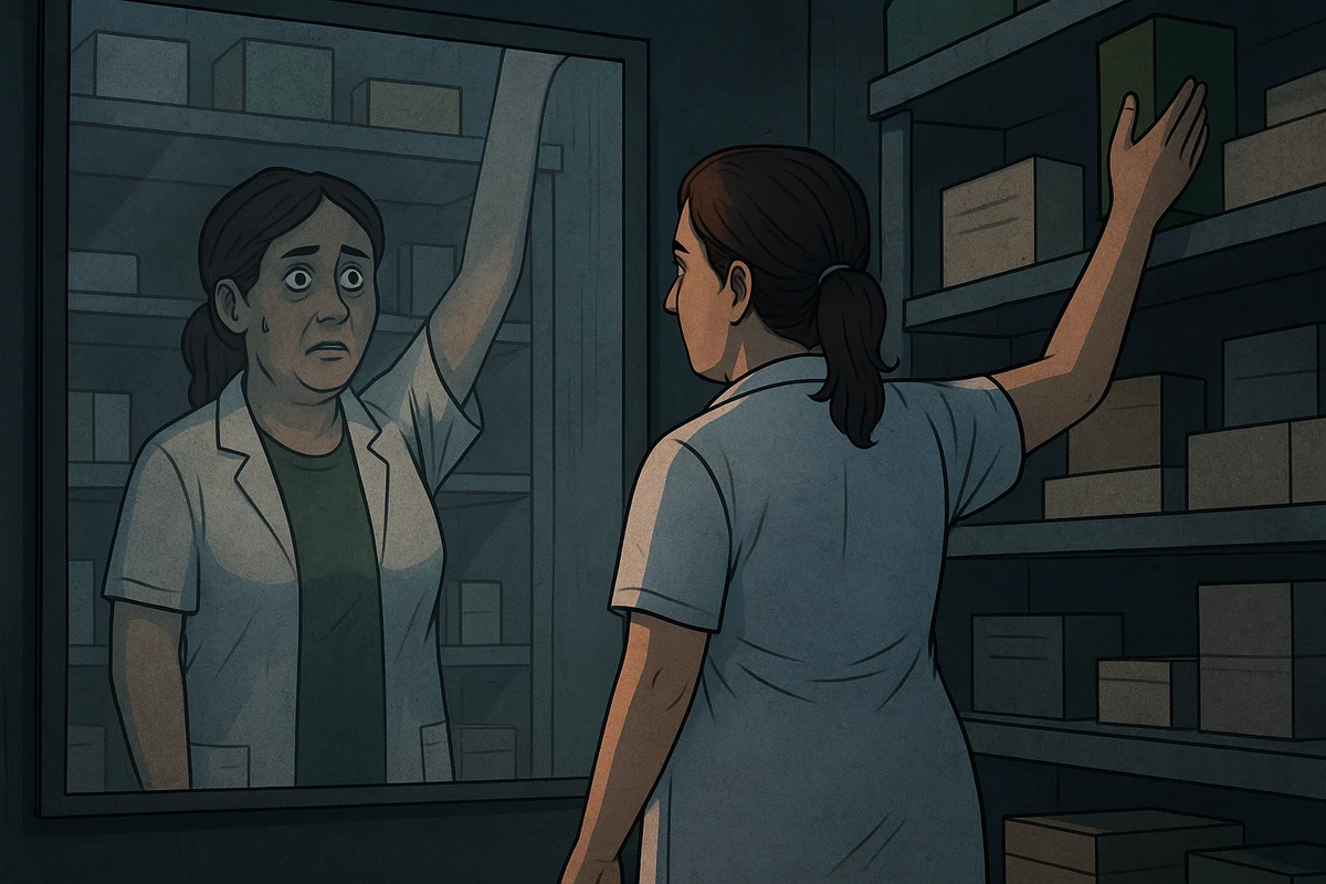 Эта история произошла с моей знакомой, Еленой, женщиной лет сорока, которая работала в аптеке на окраине нашего небольшого городка. Аптека была старой, с облупившейся краской на вывеске и скрипучей деревянной дверью, но местные ценили её за круглосуточную работу. Елена устроилась туда недавно, и, хотя она была человеком практичным и не верила в слухи, коллеги, проработавшие там годами, нередко шептались о странных вещах, которые происходили по ночам. Рассказывали о шорохах в пустых коридорах, о холоде, который пробирал до костей даже в тёплую погоду, и о странных тенях, мелькавших в окнах. Елена только посмеивалась над этими байками, считая их выдумками скучающих сотрудниц. Однажды Елена заступила на ночную смену. К десяти вечера аптека опустела: продавцы из соседнего отдела ушли, охранник, сделав последний обход, попрощался и тоже покинул здание. Елена закрыла входную дверь на тяжёлый засов, оставшись в одиночестве. Ночная смена в аптеке — дело привычное: покупатели приходят даже в по