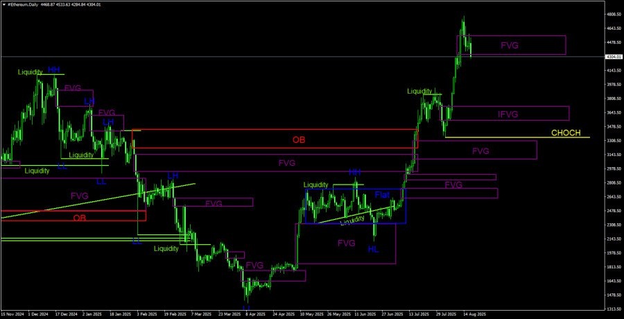 https://basechop.ru/wordpress/?p=54362 Эфир продолжает торговаться в восходящем русле и практически не корректируется. За последнюю неделю цена немного откатилась вниз, но при этом сказать, что началась коррекция, пока все еще сложно. Возможно, она действительно началась, но из «медвежьих» признаков у нас имеется только один «медвежий» FVG на 4-часовом ТФ. Напомним, что биткоин сформировал целых четыре признака разворота вниз, да еще и на дневном ТФ. Таким образом, верить в падение биткоина в ближайшее время гораздо легче, чем в падение эфира. В последнее время эфир слабо коррелировал с биткоином. Однако хотим напомнить, что это, скорее, исключение из правил, чем само правило. Эфир взлетел в область своих исторических максимумов, но не сумел снять ликвидность на недельном ТФ. Впрочем, это не самая большая проблема. Со снятием ликвидности на продажу, да еще и на самом старшем ТФ ожидать падения эфира было бы гораздо проще. Но его не было. Честно говоря, мы не поддерживаем дальнейший р