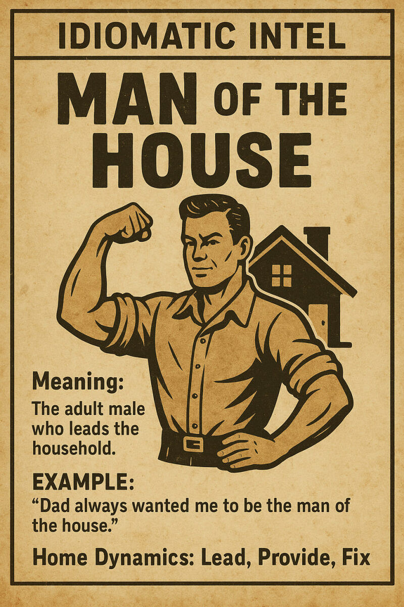 📄 “Man of the House” – Idiom Intel Drop 🧭 To: ESL Cadets of Figurative Language & Social Roles 🔍 From: GS Department of Idiomatic Precision & Domestic Operations 📅 Date: 5.09.2025 🎯 Mission Objective: Understand and decode the idiom “man of the house” — a classic phrase rooted in tradition, shifting in tone, and still used in conversations about roles and responsibility. 🧠 Idiom: “Man of the house” 👤 Meaning: The person (usually male) who takes charge of family responsibilities — especially in the absence of a father or other adult male. It can also mean the leader or caretaker in a household. 💬 Example: “When Dad left on a business trip, Tim became the man of the house.” 📎 Translation: Tim took over the family responsibilities while Dad was away. 🧭 Cadet Breakdown: 🔹 When is it used? In informal, family-based situations. 🔹 Who says it? Often parents, elders, or in family dramas. 🔹 Modern view? Gender roles are changing — nowadays, anyone can lead the house. Still, the ph