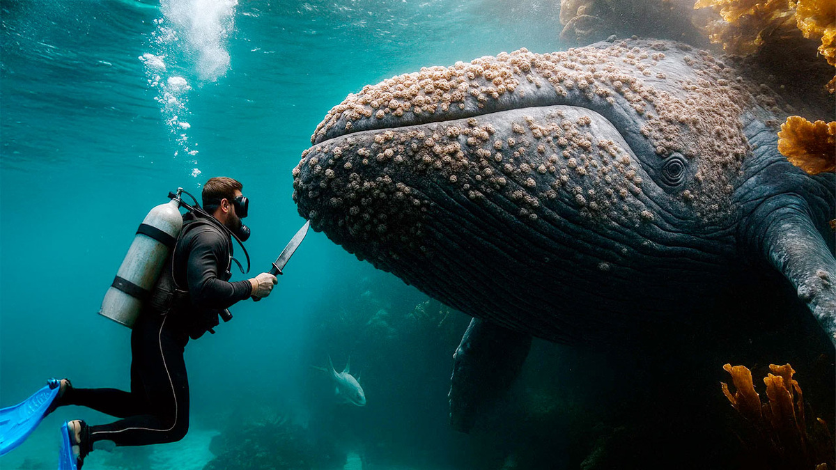 Солнечные лучи пробивались сквозь толщу воды у берегов Британской Колумбии. Для опытного дайвера Марка Андерсона это должно было быть обычное сентябрьское погружение. Он уже более десяти лет снимал подводный мир и не раз встречал морских гигантов. Но в тот день его ждал совершенно особенный случай. Внезапно рядом появился молодой горбатый китёнок. Его движения были странными, полными тревоги и мольбы. Он то подплывал совсем близко к Марку, то отплывал в сторону, будто настойчиво приглашая его следовать. Такое поведение было совершенно необычным для дикого животного. 👉 Что случилось дальше — смотрите в видео: Марка словно вёл невидимый проводник. Китёнок упорно плыл вперёд, оглядываясь, чтобы убедиться — человек всё ещё рядом. Так они добрались до подводной долины, где дайвер увидел нечто ужасающее: огромная самка горбатого кита — вероятно, мать малыша — почти неподвижно висела в воде. Её тело было сплошь покрыто толстым слоем паразитов-барнаклов. Это выглядело как приговор: такие кол