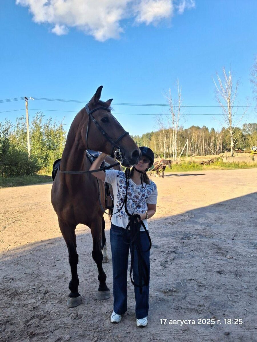 Лошадь по имени Империя, сокращенно Пуся🤗 Первый урок по выездке (или…не знаю пока, как это называется правильно), но смысл в том, что я училась держаться в седле. Сначала мне пришлось держаться за седло двумя руками, к концу занятия я стала держать равновесие (по ровной дороге) Благодаря моему чудесному инструктору Надежде, мы с Пусей скакали уже рысью и галопом кажется… и у меня получалось! Я молодец😁 Инсайты: 🤔Лошадь не жует железо (металлическая часть узды не касается зубов). 🤔Лошадь влияет на нервную систему человека (моя тренер ведет занятия по иппотерапии для людей с такими диагнозами, как аутизм и другими нарушениями ЦНС ) 🤔Не буду утомлять своими инсайтами по управлению лошадью, посадкой на определенном месте «попы» и равновесию.. Что сегодня на утро: Болят те самые места, участвовавшие в посадке Колено (проблемное) в норме Хочу на лошадь😁 Хочу научиться лучше. А вы умеете ?