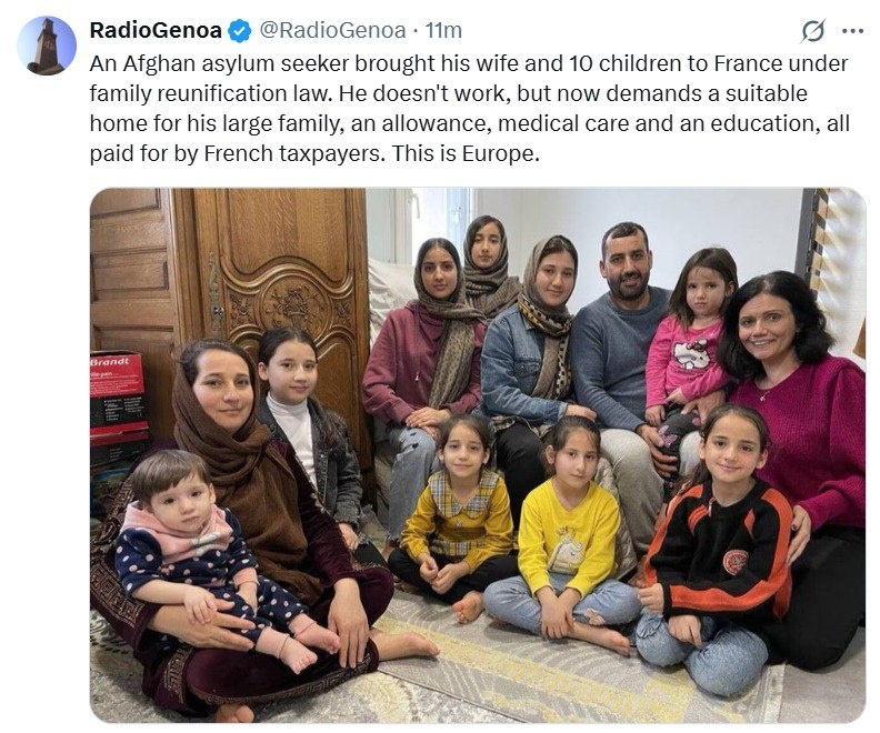 Тут, в европах сообщают, что трудолюбивый примерный семьянин из Афганистана, пользуясь действующим в ЕС законом "о неразделённых семьях", перевёз во Францию жену и 10 детей. Естественно, образцовый богобоязненый семьянин нигде не работает, зато настойчиво требует отдельный дом, пособия, медстраховку и бесплатное образование для своего семейства за счёт налогов толерантных идиотов коренных французов. Вам это ничего не напоминает? Вот и мне. Ничего. Потому что там бездуховный загнивающий Запад, а у нас свой цивилизационный путь развития.