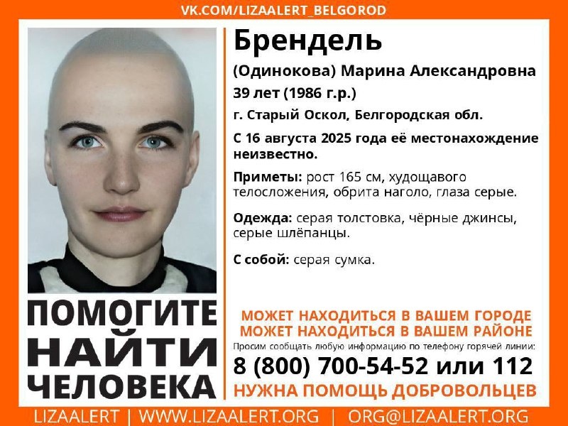 Брендель (Одинокова) Марина Александровна, 39 лет, г. Старый Оскол. С 16 августа 2025 года еë местонахождение неизвестно.