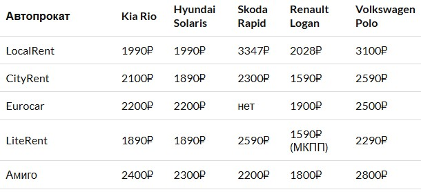 Давайте посмотрим на цены и тарифы от различных прокатчиков, включая LocalRent, CityRent, Eurocar, Lite-Rent и Амиго.
