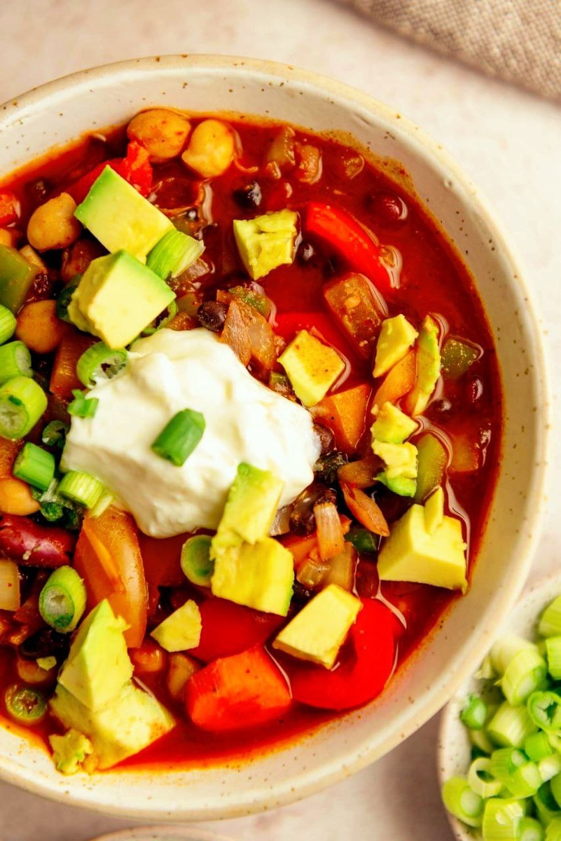 Время готовки: 25 минут Для подачи Зеленый лук, кинза или петрушка, веганская сметана, авокадо, лепешки или чипсы. В большой кастрюле или казане разогрейте масло на среднем огне. Обжаривайте лук, морковь и болгарский перец 5-7 минут, пока лук не станет прозрачным. Добавьте чеснок и халапеньо, готовьте ещё 1 минуту. Всыпьте все специи: паприку, тмин и копченую паприку. Перемешайте и обжаривайте вместе с овощами 1-2 минуты, чтобы они "раскрылись". Добавьте томатную пасту, хорошо перемешайте. Затем всыпьте промытые бобовые и влейте овощной бульон. Доведите до кипения. Уменьшите огонь до среднего и варите чили без крышки 15-20 минут, периодически помешивая, пока оно не загустеет, а морковь не станет мягкой. В конце приготовления попробуйте и при не