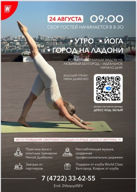 Йога с панорамным видом на любимый Белгород — идеальное начало дня! 🥹 #идёмплатно 24 августа на смотровую площадку на крыше «Школы 21» по адресу: ул. Ватутина, 1Г ➡️ Уточнить все детали и забронировать место можно по ссылке ➡️ Программа мероприятия: — практика йоги с опытным тренером Ниной Дьябелко; — расслабляющая музыка, созданная профессиональным диджеем; — завтрак от партнёров; — подарки от клуба World Class Белгород. А вы когда-нибудь посещали такие занятия? ❤️ — дааа! Йога — 🔥! 👍 — нет) Не забудьте подписаться на наш канал ❤️