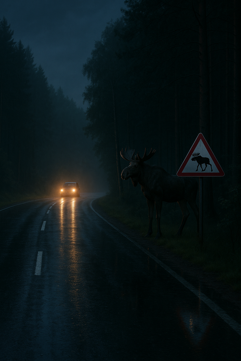 Лось высокий и тёмный: при ударе основная масса падает на лобовое и стойки. Ночью дистанция видимости короткая, поэтому главная стратегия — ехать так, чтобы полностью остановиться в пределах света фар и не делать резких манёвров.
