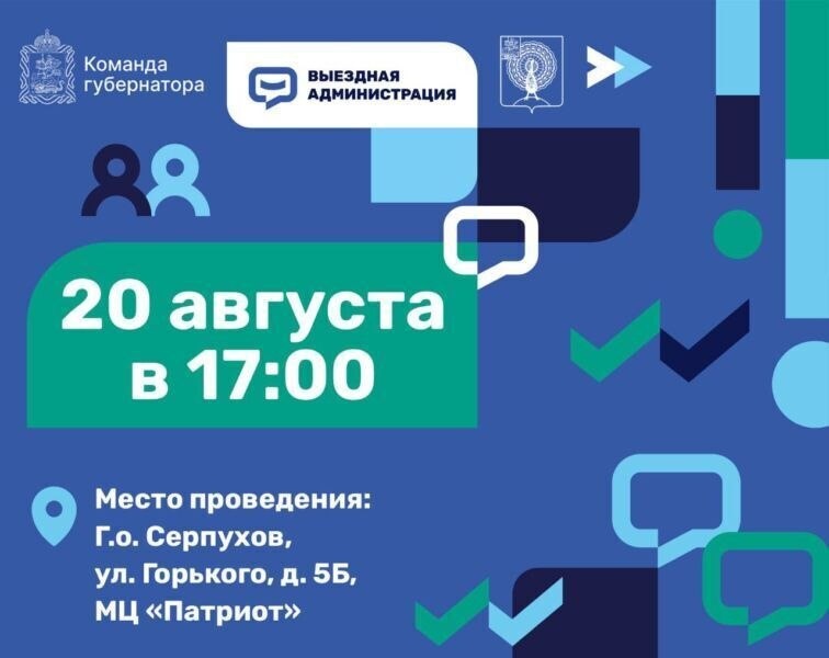 Выездная администрация будет работать в центре Серпухова 20 августа в 17:00 выездная администрация будет работать в Молодёжном центре «Патриот». На вопросы жителей городского округа ответит глава муниципалитета, его заместители, депутаты окружного Совета и представители профильных служб. Адрес: г. Серпухов, ул. Горького, д. 5Б, МЦ «Патриот».