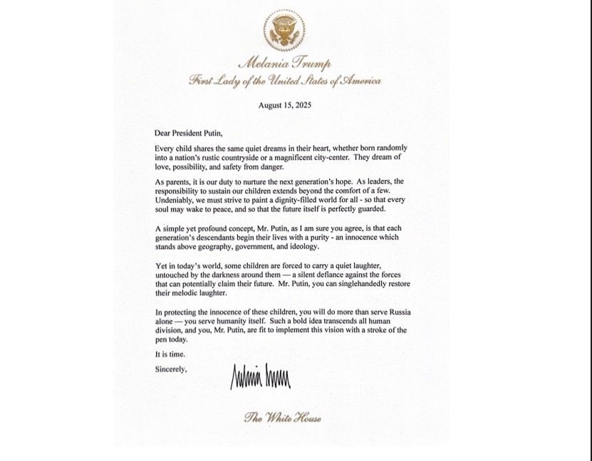 Её слова в подлиннике находятся на картинке на сайте https://charter97.org/en/news/2025/8/17/652328/. Программа распознания с картинки – ABBYY. Перевод на русский осуществлён в сайте https://yandex.ru/search/?text=%D0%BF%D0%B5%D1%80%D0%B5%D0%B2%D0%BE%D0%B4+%D1%81+%D0%B0%D0%BD%D0%B3%D0%BB%D0%B8%D0%B9%D1%81%D0%BA%D0%BE%D0%B3%D0%BE+%D0%BD%D0%B0+%D1%80%D1%83%D1%81%D1%81%D0%BA%D0%B8%D0%B9&search_source=dzen_desktop_safe&lr=218690. Текст Мелании – косым шрифтом, мой текст – прямым шрифтом. «Уважаемый Президент Путин. У каждого* ребенка в сердце таятся одни и те же тихие мечты, независимо от того, родился ли он случайно в сельской местности или в великолепном центре города. Они мечтают о любви, возможностях и безопасности от опасностей. Как родители, мы обязаны питать надежду следующего поколения. Как руководители, мы несем ответственность за поддержку наших детей, и это не ограничивается комфортом немногих. Несомненно, мы должны стремиться создать достойный мир для всех** - чтобы каждая душа