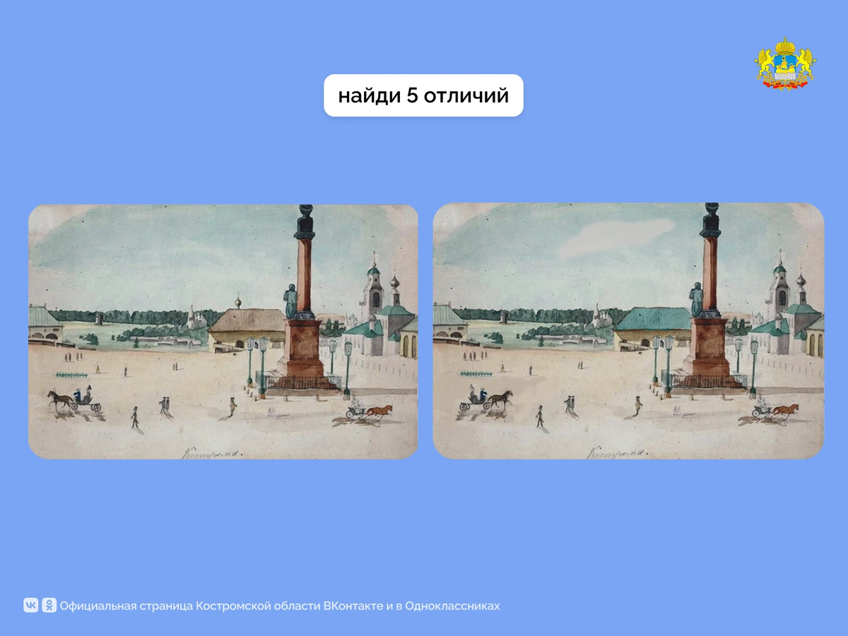 Эту картину Василий Поленов написал в 16 лет. Кострому он посетил во время туристической поездки по России с отцом и братом Алексеем. Юный художник всюду делал зарисовки акварелью и графитным карандашом. Сейчас работа хранится в Музее-заповеднике имени Поленова в Тульской области. Мы создали свой вариант полотна, расположив его справа. Предлагаем вам найти пять отличий между оригиналом и копией. Пишите их в комментариях! #КостромскаяОбласть #5отличий