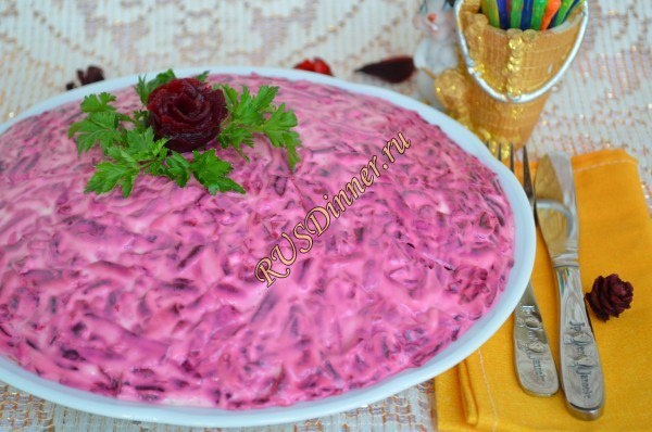 Салат «Селедка под шубой» Ингредиенты: Сельдь соленая - 250 гр. (лучше брать слабосоленую) Картофель - 250 гр. Морковь - 250 гр. Свекла - 250 гр. Лук белый салатный - 1 шт. Майонез - 250 гр. Источник: https://rusdinner.ru/page/salat-seledka-pod-shuboj