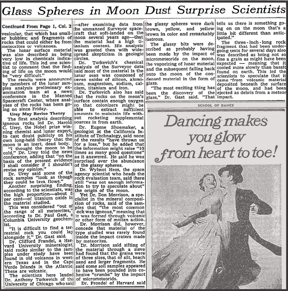 Первые данные, указывающие на наличие магматических пород, заставили доктора Гарольда К. Юри — нобелевского лауреата, химика и эксперта по Луне — публично усомниться в своей давней теории о том, что Луна является холодным и мёртвым телом.