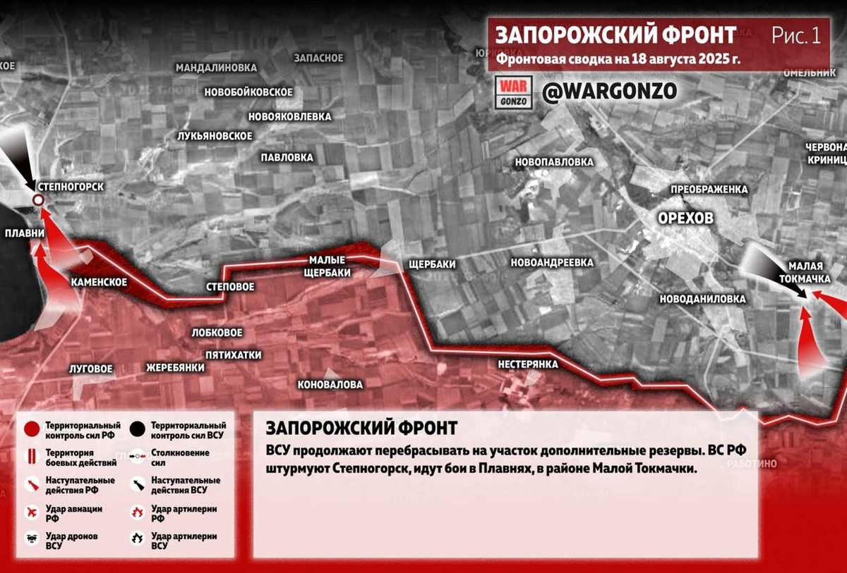 Запорожский фронт. ВСУ продолжают перебрасывать на участок дополнительные резервы. ВС РФ штурмуют Степногорск, идут бои в Плавнях, в районе Малой Токмачки. (Рис. 1) Донецкий фронт. На Южно-Донецком направлении ВС РФ наступают по линии Шевченко-Камышеваха. На Покровском направлении войска РФ атакуют в районе Чунишино южнее Покровска. Сообщается, что в самом Покровске ВС РФ продвигаются по ул. Пушкина, уничтожая живую силу и технику противника. На Добропольском участке ВСУ сосредоточили большое количество подразделений и пытаются ликвидировать выступ. Сообщается, что противнику удалось восстановить контроль над Золотым Колодезем и Весёлым. На Константиновском направлении войска РФ атакуют в направлении Плещеевки и Нелеповки, продвигаются в районе Александро-Шультино вдоль железной дороги. Поступают сведения, что ВС РФ ведут бои уже в административных границах Константиновки со стороны Предтечино. (Рис. 2) Часовоярское направление. Сообщается, что ВС РФ продвигаются в Николаевке и