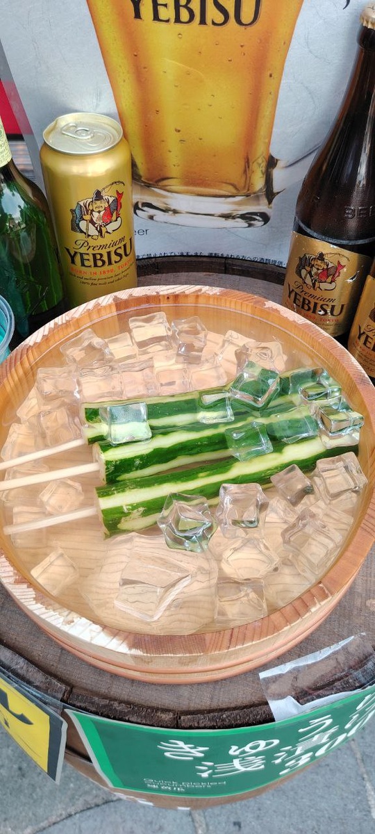 Огурец в Японии - деликатес! 🥒🥒🥒 Продолжаю рассказывать вам о Японии с точки зрения огородника #Япония_Аленинсад 🥒Вот такой деликатес по- японски - огурец в воде со льдом на палочке. Это традиционное японское употребление огурцов, с давних времен. 🥒Вообще, огурцы - большая редкость в продаже😭 В довольно крупном продуктовом мы нашли их только в нарезке в пакете с какой-то жидкостью. Не стали покупать. 🥒А на рынке сегодня я их нашла... У нас такие курам скармливают! А тут один семенник стоит 260 р🤬