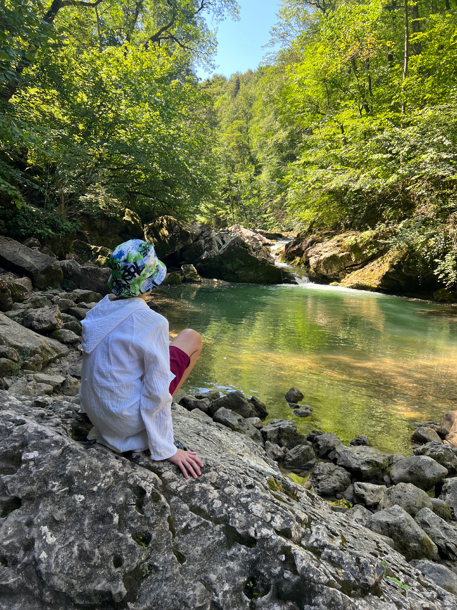 Посёлок Мезмай в Апшеронском районе Краснодарского края окружён тремя ущельями. С юго-запада от посёлка знаменитое Гуамское ущелье. С востока — Мезмайское. А с севера — Курджипсское. Именно в Курджипсское ущелье мы решили сходить. Тропа в ущелье начинается с улицы Заводской. И через метров 50 после её начало приводит к первому интересному месту — водопаду Шестиметровка. Правда скорее это даже не водопад, а просто каскад порогов, но под ним купель глубиной 6 метров. Куда можно прыгать со скалы. Вода достаточно холодная. В доме который мы снимали в Мезмае жили две собаки и кошка. Кормят их те кто заселяются в этот дом и один из пёсиков составил нам компанию на этот маршрут (второй не смог потому-что он слишком большой). Тропа вдоль скал ущелья в некоторых местах достаточно опасная и узкая. В таких местах натянуты для страховки тросы. Внизу ревёт река Курджипс. Вверху — скалы. Виды на реку очень красивые, но сильно отвлекаться на них лучше не надо ведь тропа опасная. После дождей не рек