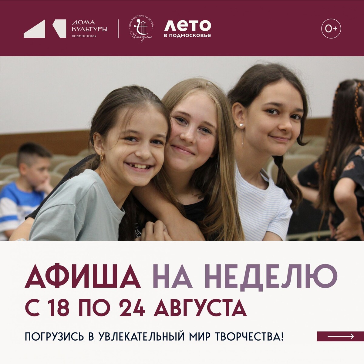 Дома культуры городского округа Домодедово приглашают всех на свои мероприятия! Скорее смотри, что ждёт тебя в период с 18 по 24 августа!🥳🤗