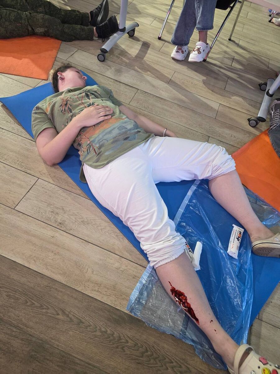 Всем доброе утро ☀️ Решила с вами поделиться еще интересными кадрами с нашего вчерашнего обучения первой помощи в «Доброе место. ЦАО»❤️ Внимание! На фото и видео присутствует искусственная кровь, никто из людей не пострадал, все ситуации вымышлены и несут исключительно учебный характер😌 Итак, подробнее о первой ситуации: молодой человек схватился за оголенный провод в результате чего получил электротравму. Нашей задачей было оказать первую помощь. Этим заданием проверяли наши навыки. К сожалению, все 14 человек не увидели провода и легли с электротравмами рядом с пострадавшим 😅 Вторая ситуация: на форуме волонтеров медиков проводился мастер-класс, кто-то кушал, кто-то слушал, кто-то демонстрировал. На стол перед ребятами упала стеклянная люстра, 4 раненных: девушка с поверхностными ранениями и паникой, молодой человек с глубоким ранением предплечья и без сознания, девушка (я) с осколком в ноге, глубокой раной и без сознания, девушка с травматической ампутацией кисти и без сознани