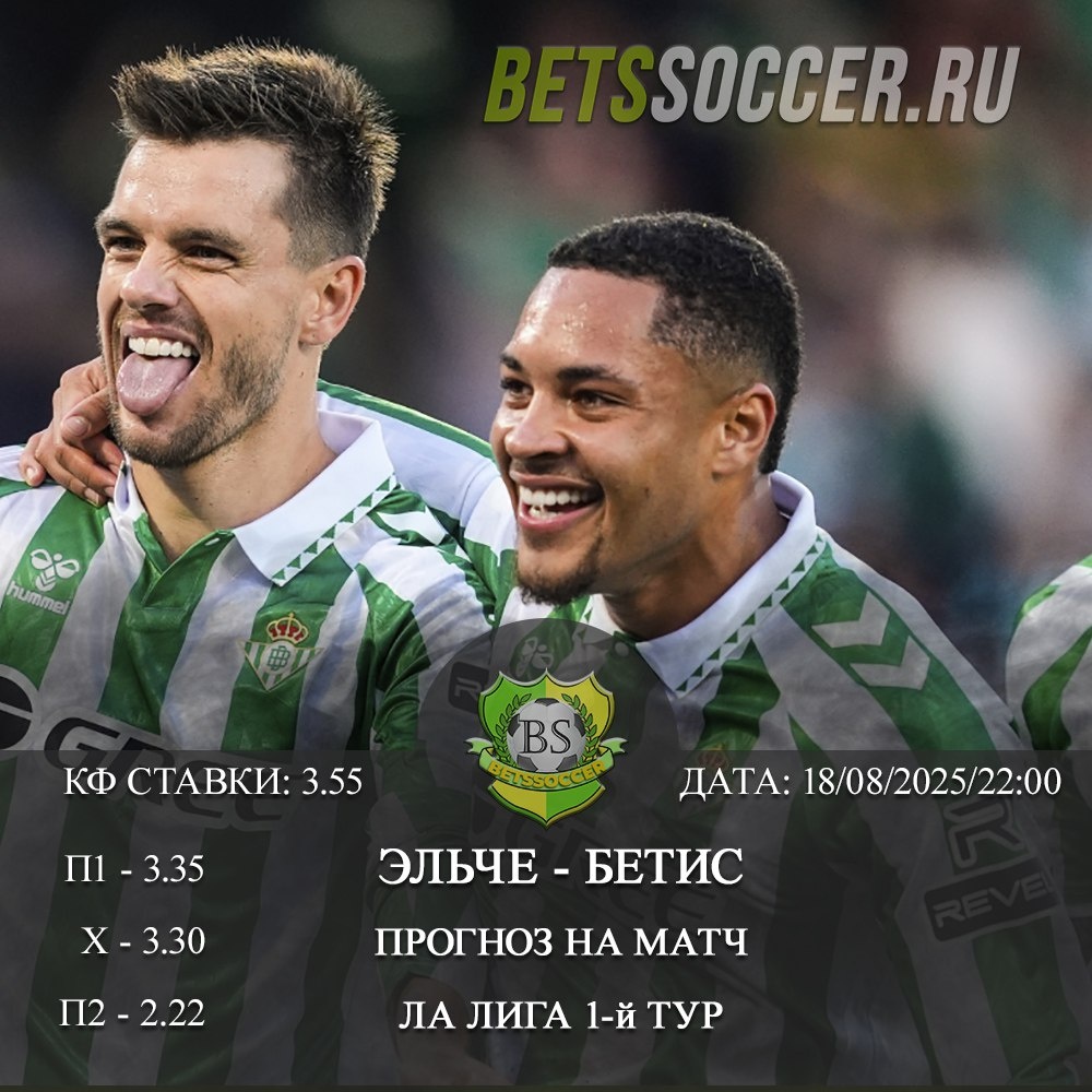 ⚽️ Эльче – Бетис: Ла Лига 1 тур (18/08/2025/22:00) 💬 Эльче вернулся в высший дивизион, и его основная цель на текущий сезон — сохранить место в Ла Лиге. Бетис, в свою очередь, будет представлять Испанию в Лиге Европы, что говорит о высоком уровне команды. В межсезонье Эльче демонстрировал нестабильные результаты. Несмотря на это, преимущество в данном матче отдается Бетису, который, вероятно, одержит победу. Ожидается, что встреча будет результативной. 🎯 Прогноз от BetsSoccer: победа Бетиса и общий тотал больше 2,5 🎲 Коэффициенты: 3.55 (WINLINE), 3.75 (МЕЛБЕТ), 3.55 (ЛИГА СТАВОК) 👉 СДЕЛАТЬ СТАВКУ ❗️ ЗАБИРАЙ ФРИБЕТЫ 🎁 БК WINLINE 3000₽ (промокод: BETWIN) 🎁 БК МЕЛБЕТ 25000₽ (промокод: BS888) 🎁 БК ЛИГА СТАВОК 7777₽ (промокод BS777) ↗️ ПОДПИШИСЬ НА BETSSOCCER 👉 ТЕЛЕГРАМ 👉 ВКОНТАКТЕ 👉 ПОДРОБНЫЙ ПРОГНОЗ