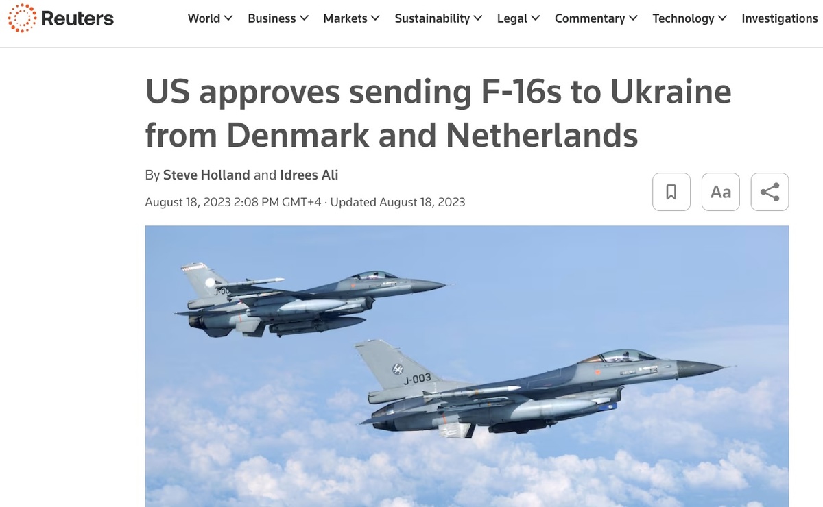 - В информационном агентстве Reuters заявляют, что американские власти одобрили передачу украинским ВВС истребителей F-16 от Дании и Нидерландов после завершения обучения экипажей. Дания и Нидерланды недавно запросили официальные гарантии США на одобрение передачи военных самолётов Украине.