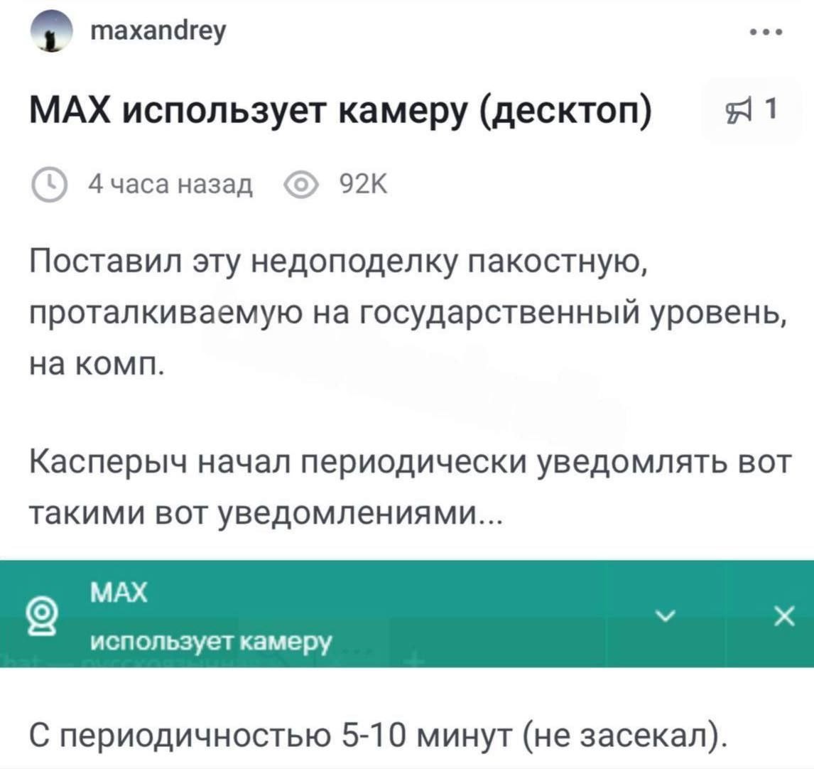 А вот вы знали, что нацмессенджер MАХ снимает вас на камеру каждые 5 минут, даже когда он в фоновом режиме?