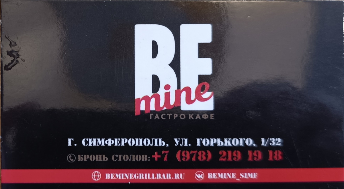 В очередных поисках обеда и с неугасаемой верой в лучшее, мы направили свои стопы в BeMine по адресу г. Симферополь, ул. Горького, д. 1/32. Изучение меню заняло много времени, так как в нём много картинок, предвещающих вкусную трапезу. Всё съесть мы не сможем, по этому пришлось тщательно выбирать. Официант вежливо нас проконсультировал, дал рекомендации и принял заказ в 11-48. Борщ со сметаной принесли в 12-16. 587 руб. Густой, свекольный вкус с скромным количеством мяса. Бульон наваристый, порция достойная. У меня складывается новая традиция, в южных заведениях, не специализированных на кавказской кухне, заказывать борщ. Везде разное его виденье. Кто-то делает с курицей, кто-то считает что просто бульона достаточно, в "Жуль Верне" в него добавляют копчёную вишню, а здесь же всё традиционно банально. Поджаренный хлеб, сметана, укроп и сало с чесноком и луком. Уверенно хороший суп. Говяжьи щёчки принесли в 12-22. 1298 руб. Одна из дорогих позиций в меню. Заявлено как острое. Оцените по