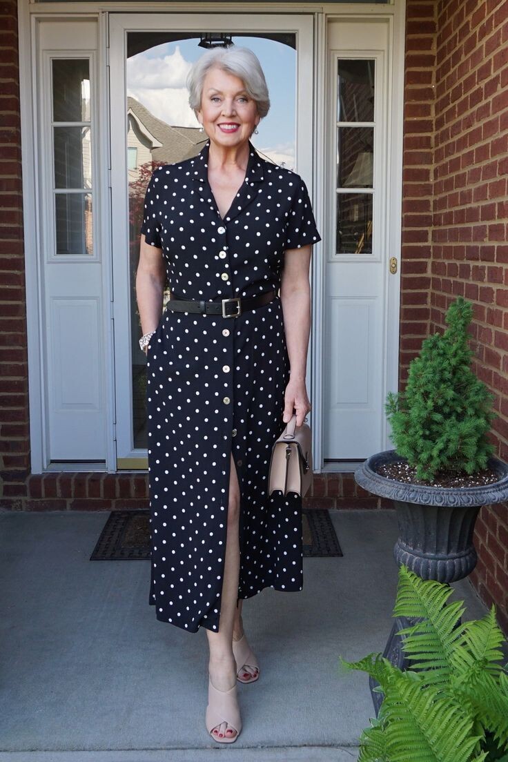 Комфорт и эффектность в стильных и по-настоящему безупречных образах для женщин 60+ плюс идут рука об руку. Идеальные наряды для зрелых дам сочетают в себе два этих качества: они хорошо сидят по фигуре и минимизируют ее недостатки, они приятны на вид и практичны в жару. А кроме того, они выглядят яркими даже в базовых цветах и неброских принтах. 1. Черное в мелкий белый «горошек» приталенное платье-рубашка с короткими рукавами – элегантная и стильная модель, в которой женщина продемонстрирует свой безупречный вкус и хорошую фигуру. Черный кожаный ремешок позволит дополнительно подчеркнуть талию, а достаточно высокий вырез, образованный расстегнутыми от колен пуговицами, покажет стройные ножки. При этом у модели очень скромный V-образный вырез, который делает ее подходящей для дамы за 60. 2. Легкие прямые белые брюки с крупными накладными карманами, дополненные тонкой белой рубашкой в светло-коричневый «горошек», – это очень по-летнему, очень стильно, и очень комфортно для женщины зрелы