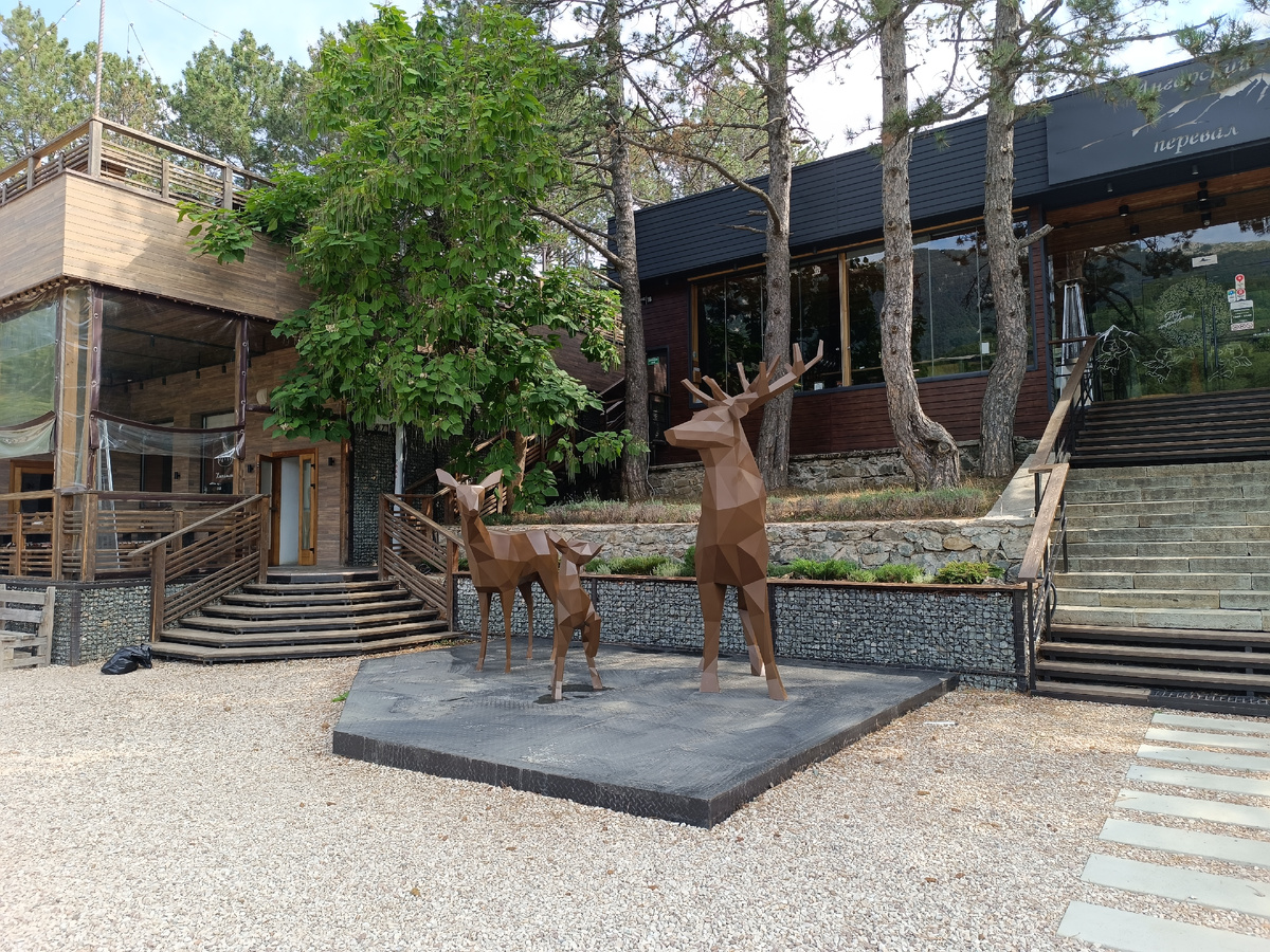 На съезде трассы "Симферополь-Алушта", прямо на перевале, есть новый модный ресторан, для туристов. Обещана авторская кухня, гриль бар, интересное меню и прекрасный вид. Именно здесь мы решили позавтракать. Деревянные олени, детский батут, скромная парковка и старая лестница встречают гостей. Входная группа не успевает за входящими. За столом нас ждал деревянный зайка, а за окном вид на заросшие горы. Впечатляет ли? Совсем нет. Приступим к изучению меню. Есть как бумажный носитель, так и web версия. Летнее меню представлено только напитками... Главное, что нас смутило, так это тар-тар. Уточнили в web меню и у официанта, оказалось что это не кошмарный сон Гордона Рамзи, а действительно в тар-таре замешаны сельдь и кетчуп. Брать не стали, посчитав это извращением. Такой гриль даёт надёжны на хорошее мясо, либо на какой-то интерактив с посетителем, но увы... Дважды посещал это место и дважды гриль был холоден как морковка снеговика на северном полюсе. Сделав заказ в 10-25, мы присту