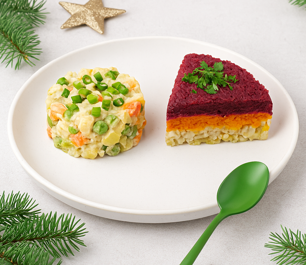 Новый год и застолья сложно представить без «Оливье» и «Селёдки под шубой». Но эти классические салаты можно приготовить в полностью веганском стиле — без яиц, колбасы и майонеза. Вкус при этом сохраняется праздничный и привычный. Ингредиенты (на 4 порции): Соус вместо майонеза: 👩🍳 Шаги: КБЖУ (на 1 порцию): ~260 ккал; Б 9 г, Ж 12 г, У 30 г Ингредиенты (на 4 порции): Соус вместо майонеза: 👩🍳 Шаги: КБЖУ (на 1 порцию): ~240 ккал; Б 7 г, Ж 8 г, У 35 г Такие версии «Оливье» и «Шубы» ничуть не уступают классике, но при этом легче, полезнее и полностью веганские. Они отлично смотрятся на праздничном столе и понравятся даже тем, кто обычно скептически относится к «здоровым» заменам. #оливье #шуба #веганновыйгод #веганрецепты #праздничныйстол #безмайонеза #полезнаяеда