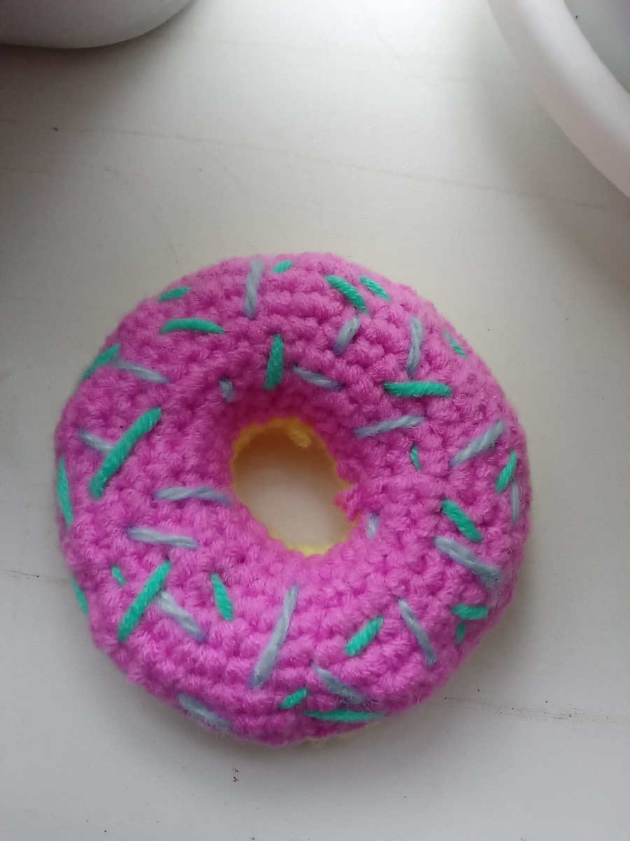 - 64 в п в кольцо. - 5 рядов по 64 ст. - 6 ст, 1 уб. - 5 ст, 1 уб, - 4 ст, 1 уб. - 3 ст, 1 уб. - 32 ст. Меняем цвет не довязывая последний столбик. - 32 ст. Другим цветом. - 3 ст, 1 пр. - 4 ст, 1 пр. - 5 ст, 1 пр. - 6 ст, 1 пр. - 3 ряда по 64 ст. - Соединительный столбик за заднюю полупетлю. Сшиваем пончик цветом глазури за задние полупетли. Набиваем. Посыпку делаем цветными нитками мулине.