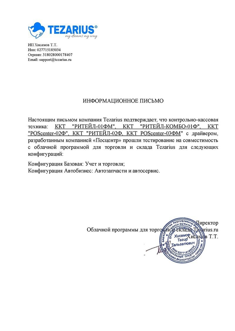 Компания Tezarius официально заявила о прохождении тестирования совместимости своей облачной программы для торговли и складского учета с рядом моделей контрольно-кассовой техники: ККТ "РИТЕЙЛ-01ФМ" ККТ "РИТЕЙЛ-КОМБО-01Ф" ККТ "POScenter-02Ф" ККТ "РИТЕЙЛ-02Ф" ККТ "POScenter-03ФМ" (новая модель в линейке ККТ POScenter) Устройства проходили тестирование с драйвером, разработанным компанией POScenter, для следующих конфигураций: Конфигурация Базовая: Учет и торговля Конфигурация Автобизнес: Автозапчасти и автосервис