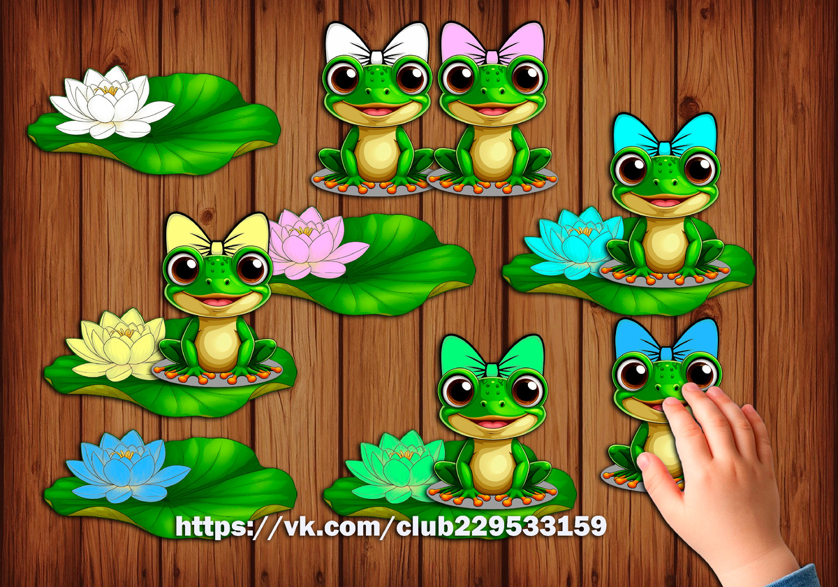 Помоги лягушкам сесть на свои листья! На столе лежат 6 милых лягушек, у каждой на голове есть бантик своего цвета. Рядом — 6 листиков с кувшинками разных цветов, каждый цвет соответствует одному из бантиков на лягушках. Ваша задача — помочь каждой лягушке сесть на правильную кувшинку. Посмотрите внимательно на бантики на головах лягушек и на цвет кувшинок на листиках. В игре можно использовать липучки. <ссылка на ШАБЛОН в конце статьи> Игра "Помоги лягушкам сесть на свои листья!" развивает: ШАБЛОН можно скачать по ссылке. Просто нажми на слово ШАБЛОН