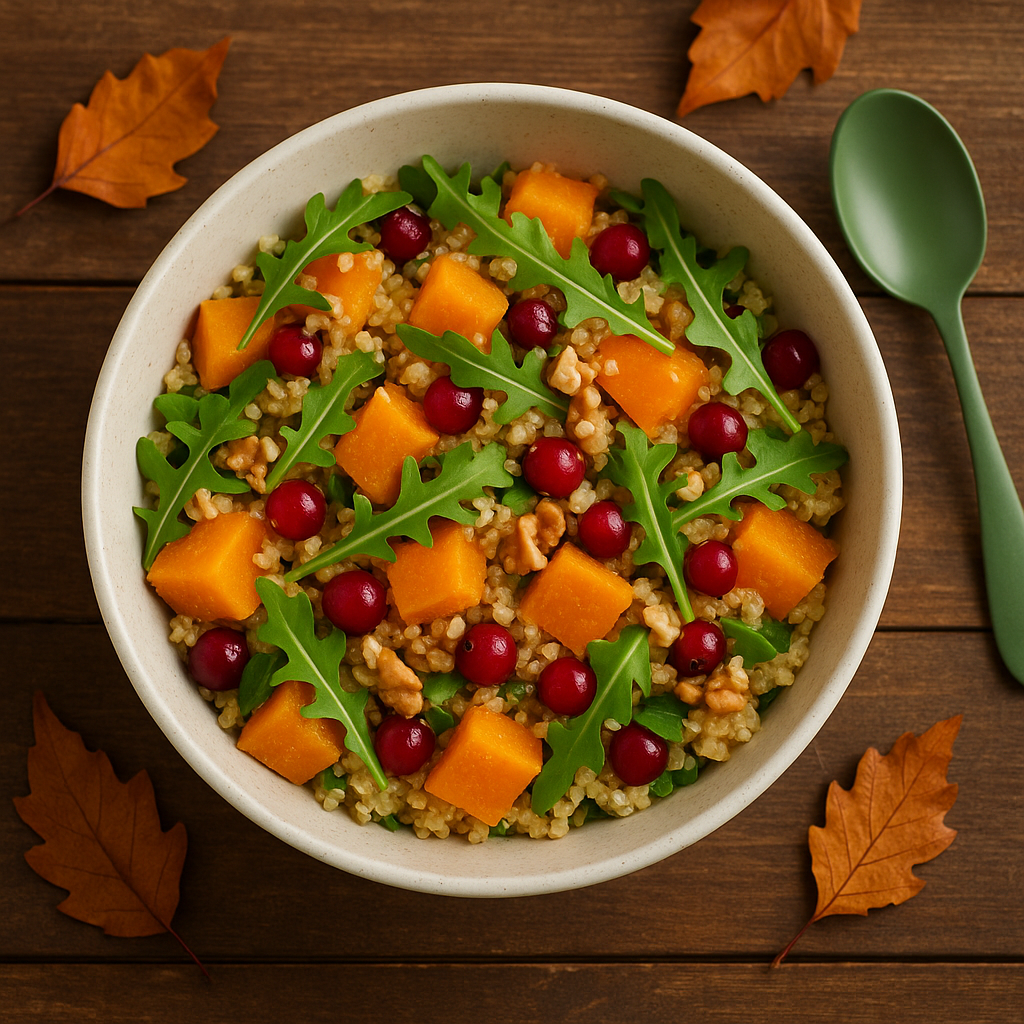 Осенью особенно хочется тёплых и ярких блюд. Этот салат сочетает в себе питательную киноа, сладковатую запечённую тыкву и кислинку клюквы. Он получается лёгким, но сытным, а ещё очень красивым — настоящий сезонный must-have для веганского меню. Этот салат — настоящий осенний хит. Он сочетает в себе сытность киноа, яркость тыквы и освежающую кислинку клюквы. Подходит как самостоятельное блюдо или как лёгкий гарнир. #осенниерецепты #салаты #веганрецепты #тыква #киноа #здоровоепитание #полезно