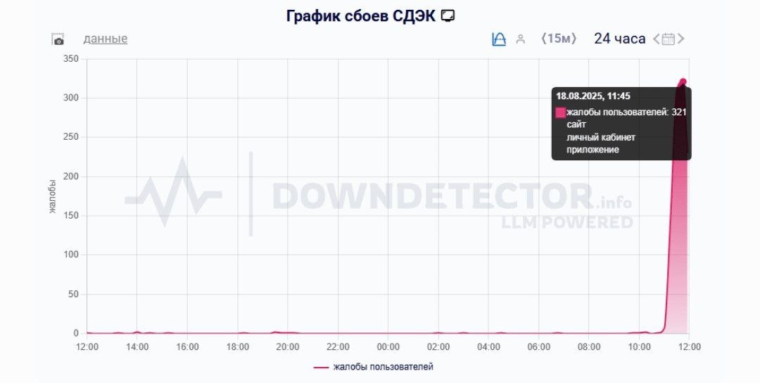 ⚡ Сегодня в работе СДЭК произошел сбой 18 августа: жалобы на Downdetector.su за сутки превысили отметку в 800, на пике число сообщений о неполадках достигало 321.