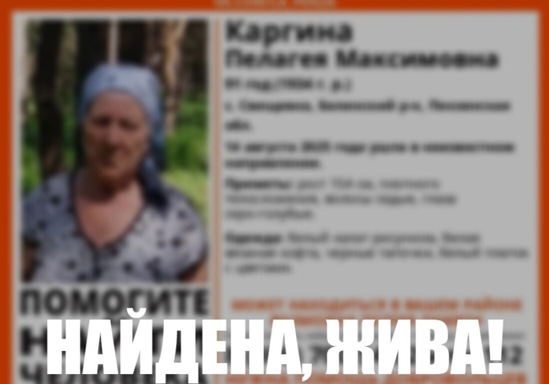 Завершены поиски пенсионерки из с. Свищевка Белинского района. В группе поискового отряда «Лиза Алерт» Пензенской области в социальной сети сообщили о том, что 91-летняя Пелагея Каргина нашлась. «Найдена, жива!» - такая подпись появилась на ориентировке на нее. Ранее сообщалось, что 14 августа женщина ушла в неизвестном направлении, у нее возможна потеря памяти. Поисками занимались близкие, полиция и добровольцы. При каких обстоятельствах была найдена жительница Свищевки, не сообщается. Кроме того, стало известно, что найдены еще двое пропавших жителей Пензенской области. Оба найденных жителя региона оказались живы. 33-летний житель с. Соловцовка Пензенского района Владислав Гребенщиков пропал 30 июля. С тех пор информации о его местонахождении нет.
