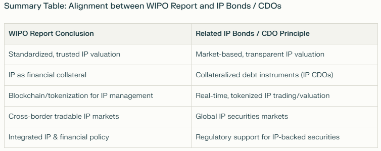 The 2025 WIPO Pathfinders Report describes trends, priorities, and scenarios that intersect with the solutions, models & mechanisms underlying IP Bonds & IP CDOs. Let's dive in the report conclusions. Economic Forces and Intangible Asset Valuation Financial Instruments and IP as Collateral Digital Transformation and Blockchain Integration with Global Financial Markets IP Policy Recommendations In summary: The 2025 WIPO Pathfinders Report actively advocates for IP Bonds & IP CDOs underlying principles: market-based IP valuation, use of IP as financial collateral, development of IP-backed securities and financial instruments, blockchain-driven digital transformation, and integration of intangible asset finance with the broader economic system. The 2025 WIPO Pathfinders Report is the groundwork for the emergence and adoption of IP Bonds & IP CDO models worldwide.