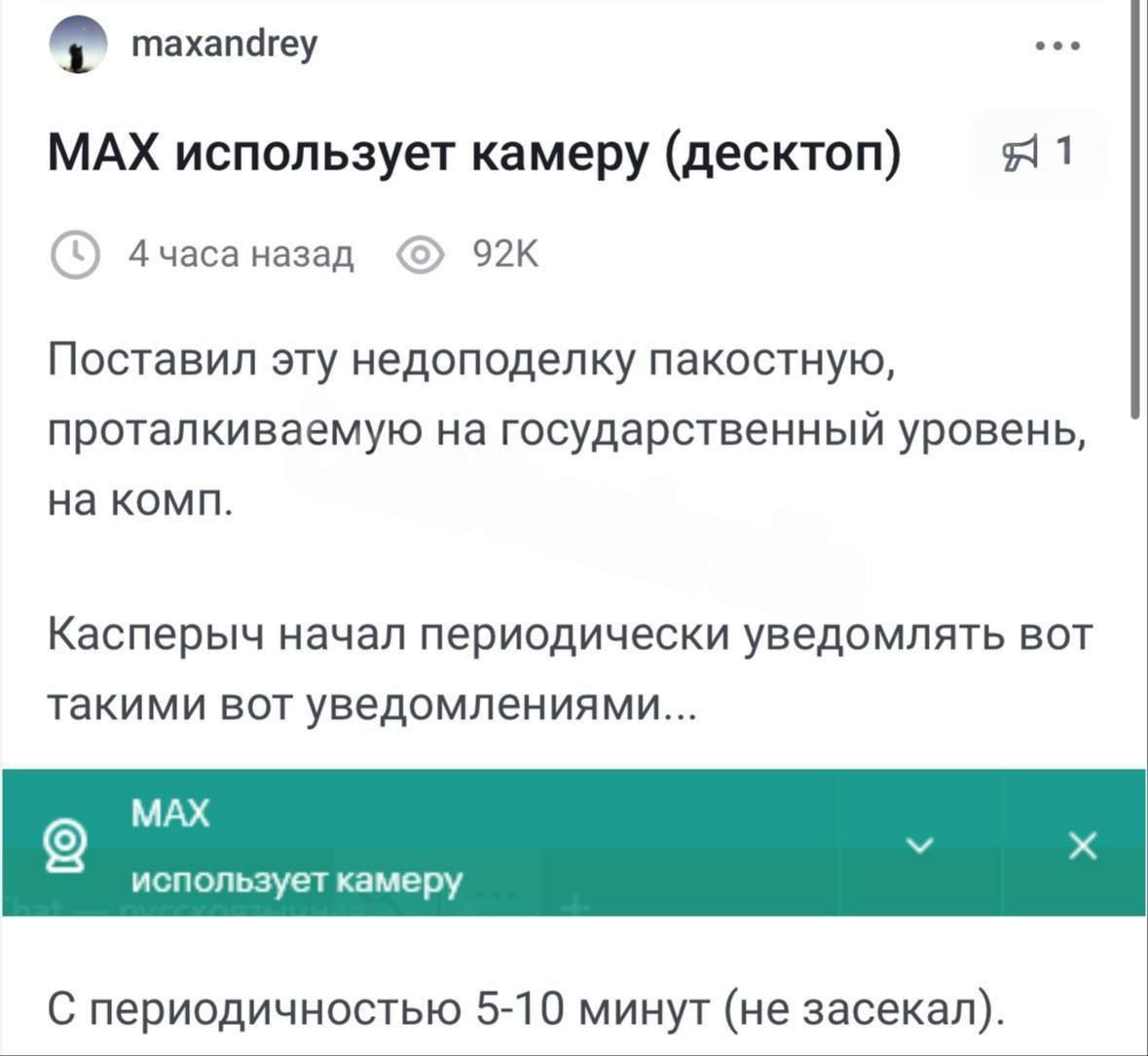 MAX сам ФОТОГРАФИРУЕТ вас на камеру каждые 5–10 минут. Фишка работает даже тогда, когда мессенджер закрыт — камеру включает автоматически. Нашли это случайно после установки десктопного клиента. Улыбаемся и машем