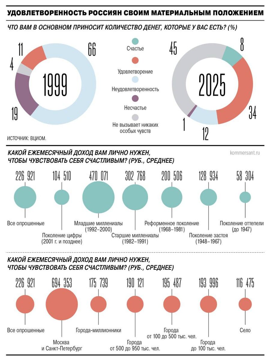Для счастья россиянам требуется 227 тысяч рублей в месяц — опрос ВЦИОМ, а москвичам и петербуржцам нужно почти 700 тысяч