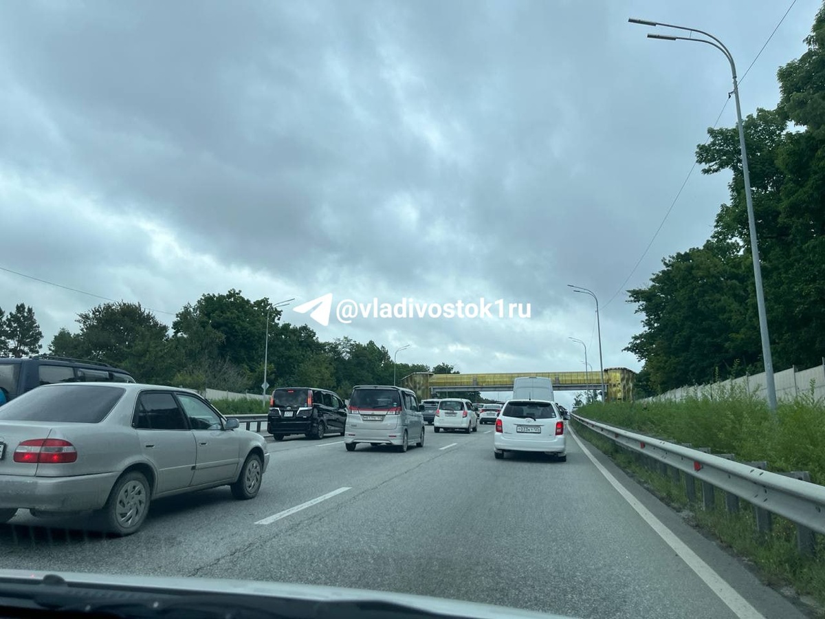 Вечерняя пробка в пригороде. За Океанской ремонтируют дорогу по левой полосе, затор тянется от Седанки.