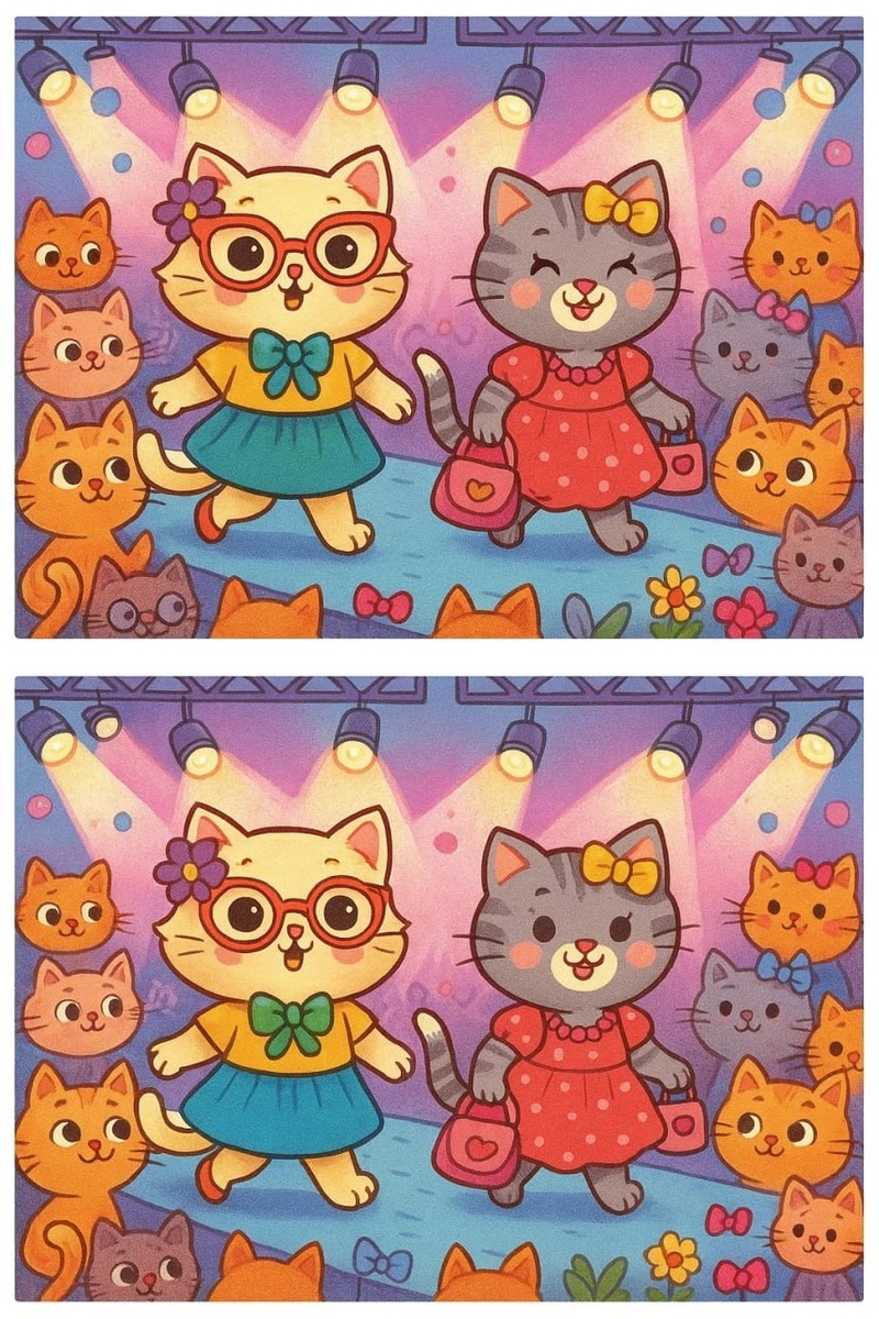 🐾 Играем вместе: «Найди 10 отличий» 🐾 Наши очаровательные кошечки вышли на модный подиум, но художник спрятал хитрые отличия между двумя картинками. Ваша задача — внимательно присмотреться и найти все 10! 🔍✨ Напишите в комментариях, сколько отличий удалось заметить. Кто найдёт все — тот настоящий модный детектив! 🕵️♀️👗