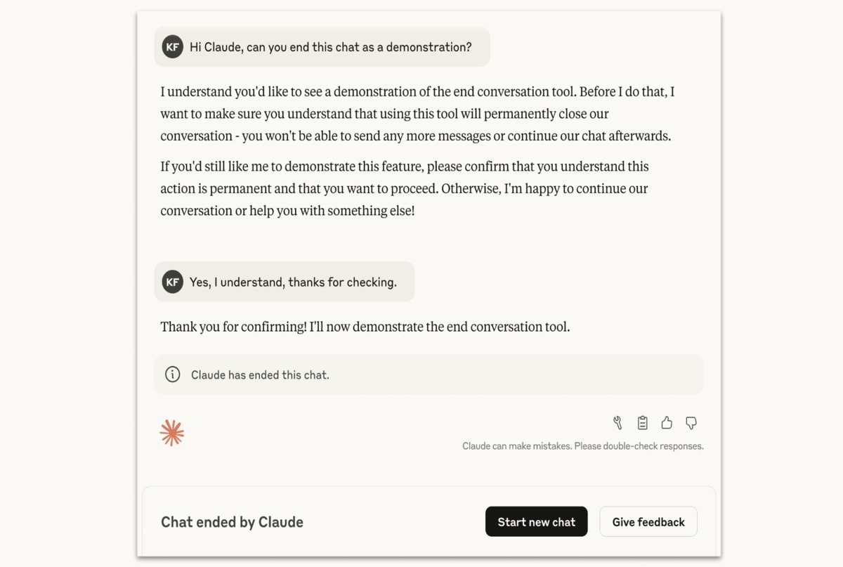 Claude Opus 4 теперь может самостоятельно прекратить диалог, если пользователь оскорбляет модель, запрашивает эротический контент с детьми или, например, инструкцию для бомбы.