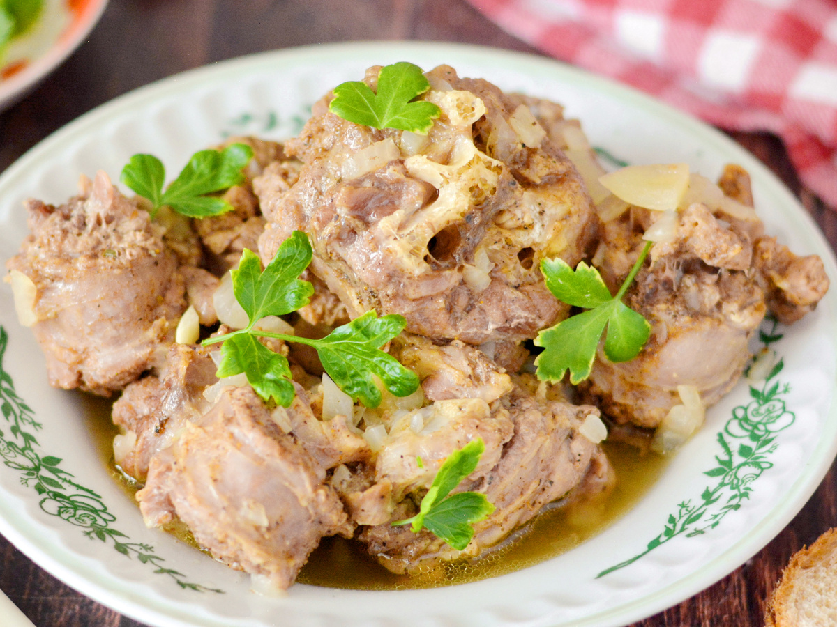Шея индейки – штука недорогая, но при этом мясо у неё куда интереснее, чем у курицы. При правильной готовке выходит сочным, ароматным и мягким. Идеальный вариант для тех, кто хочет что-то новенькое вместо вечной курицы! Готовим в мультиварке – всё закинули, ушли по делам – через 2 часа у вас мясо, которое даже жевать не надо. За счёт длительного тушения в смеси соевого соуса, мёда и специй мясо получается нежным и с лёгким привкусом шашлыка. Лук тоже даёт аромат и вкус – не выбрасывайте его, ешьте вместе с мясом. Можно приготовить сразу с гарниром – например, с картошкой – кладём в чашу примерно за полчаса до конца. Полный список ингредиентов – в конце⤵ Берём 700 г шеи индейки. Промываем под холодной водой, рубим по суставам – так удобнее есть, и быстрее протушится. В отдельной миске смешиваем 250 мл воды, 3 ст.л. соевого соуса, 2 ч.л. мёда, 0,5 ч.л. соли, 0,5 ч.л. специй для шашлыка и 2 щепотки чёрного молотого перца. Добавляем туда же мелко нарезанный лук – примерно 100 г (одна ср