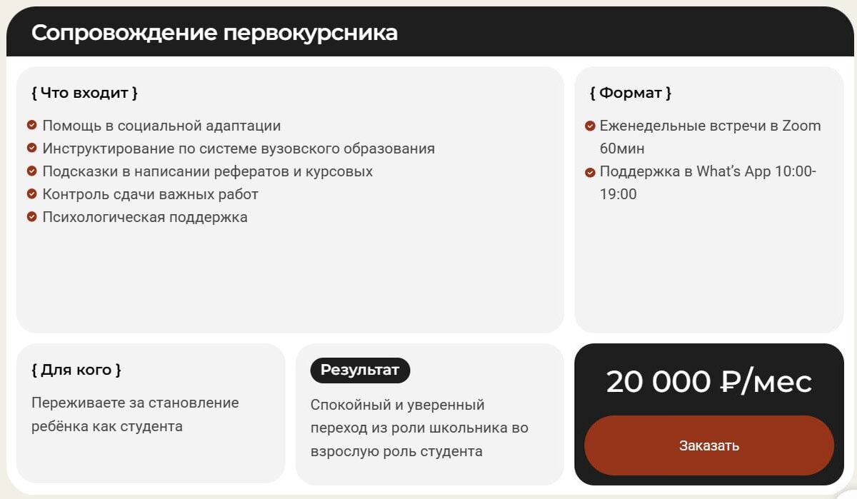 Наши опытные кураторы проведут юного студента за руку через все трудности первого курса: Коммуникация с нами будет строиться через What’s App/Telegram, где можно будет задать все волнующие вопросы. Также студента ожидают еженедельные часовые встречи в Zoom. Позаботьтесь о становлении ребенка как студента — приходите на услугу сопровождения первокурсника.