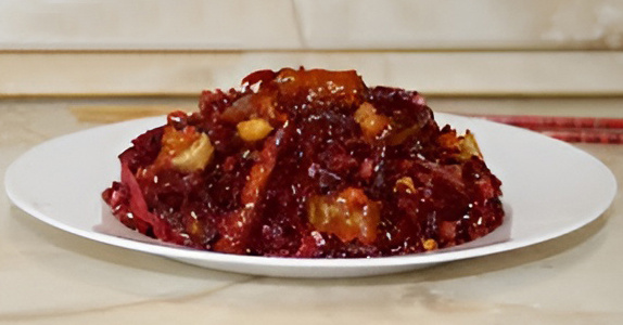 Берите на заметку рецепт Лидии Самойленко. Этот богатый витаминами салат не только разнообразит ваш рацион, но и подарит заряд энергии и бодрости. Ингредиенты: 2 свеклы среднего размера, 2 баклажана среднего размера, 1 маленький пучок рукколы, томатный кетчуп и кукурузный крахмал - опционально, соль, смесь молотых перцев, мёд - по вкусу, хлопья перца чили, лимонный сок, оливковое масло - опционально, свежая зелень и кедровые орешки - для подачи. Вымытые баклажаны нарезаем соломкой или кубиком средней толщины, посыпаем солью, заливаем небольшим количеством холодной воды и оставляем на полчаса, чтобы ушла горечь. Затем отжимаем лишнюю жидкость и дополнительно просушиваем баклажаны бумажными полотенцами. Теперь осталось их посолить, поперчить, обвалять в кукурузном крахмале и обжарить во фритюре. Вымытую свеклу отвариваем до готовности, остужаем, очищаем от кожицы, а мякоть нарезаем небольшим кубиком или соломкой. В отдельной емкости смешиваем до однородности кетчуп с лимонным соком, олив