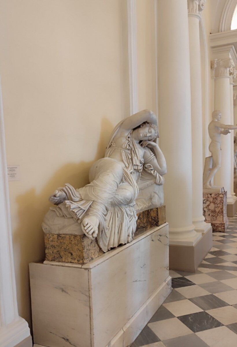-Ба! Знакомые все лица!!! Я хотела уже броситься на шею статуе, как старой знакомой, но увидела эрмитажную табличку "Не трогать!". Пришлось умерить свои восторги от встречи старой знакомой в таком огромном городе, как Санкт-Петербург, ведь только вчера я познакомилась с этой скульптурой в Михайловском замке. Статуя спящей нимфы (она же- умирающая Клеопатра, она же- отдыхающая Ариадна) была внезапно обнаружена разумеется в Италии и атрибутирована как копия с утраченного оригинала🤷♀. Остальные статуи , разбросанные по всему миру, (в одном Питере их целых две, а в Москве , в пушкинском музее, одна), атрибутированы как копии с копий . Честно говоря, я запуталась в этих скульптурах, которых , как садовых гномиков, отливали на "раз".❄️ Скульптуры идентичны между собой, отличаются только постаментами и табличкой -сопроводиловкой. Но мы знаем, что ценники к садовым гномикам меняются в зависимости от запросов рынка и ситуации на фондовой бирже) #санкт-петербург #питер #садовыегномики #