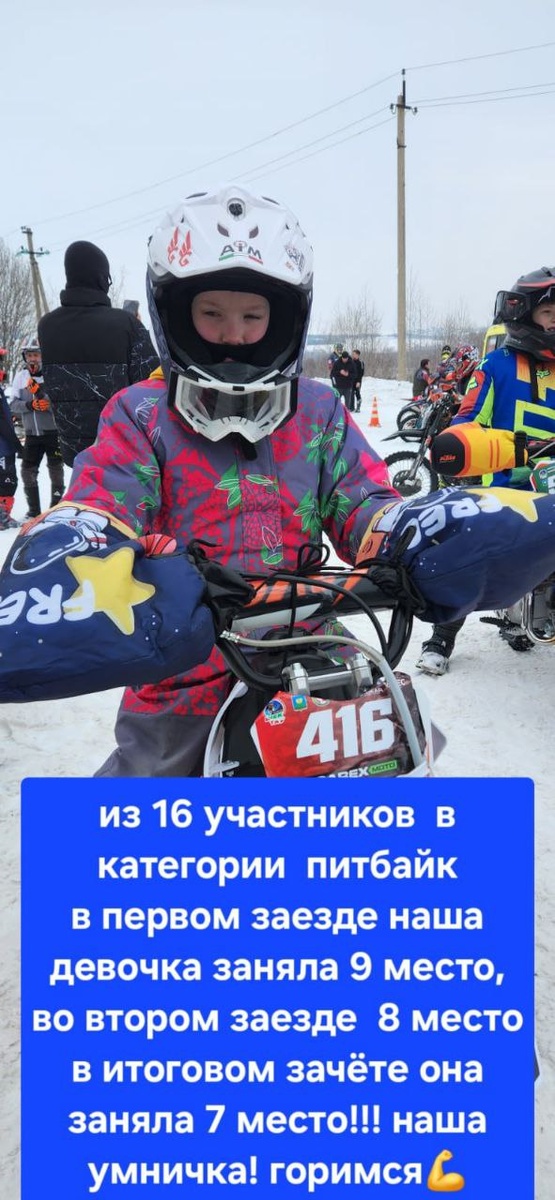 Здравствуйте, меня зовут Софья мне 10 лет)) первый раз в гонке участвовала в Каньен Биек Тау в 2025 году на масленице, мой мотоцикл кайо мини 90. Первый круг проехала так что на финиш приехала со слезами, так как забыла поставить муфты для рук😔 замерзла)) на втором круге уже немного разогналась ехала 4 но под конец упала)). Мне очень понравилось)) Сейчас занимаюсь Эндуро)) мотоцикл уже вырос со мной))) сейчас я катаю на кайо мини тд 125. Сама чищу цепь после покатушек. Учавствую в разных соревнованиях☺️☺️ пока на тумбочку не встала но делаю успехи. Спасибо за внимание!😊 Разрешаю репост.