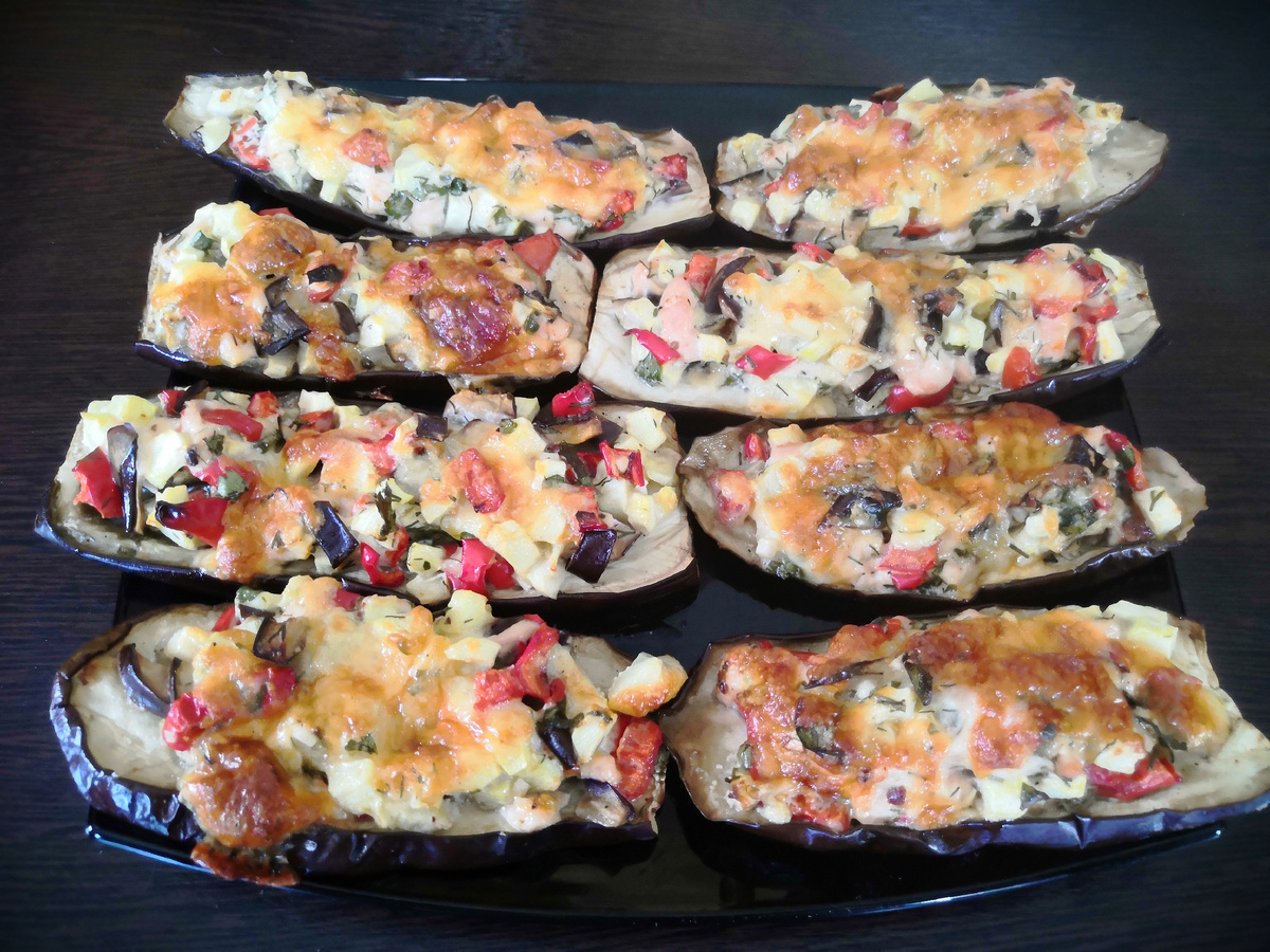 Баклажаны, запечённые с овощами и сыром. Ингредиенты: Баклажаны – 2 шт. Болгарский перец, кабачок, помидор, баклажан – нарежьте мелкими кубиками. Куриная грудка – 1 шт. – нарежьте мелкими кусочками или измельчите в блендере. Чеснок – мелко нарежьте или натрите на терке. Укроп, петрушка и базилик – свежая зелень. Специи и соль – по вкусу. Майонез – 2–3 ст. ложки. Твердый сыр – 100–150 г. Приготовление: Баклажаны нарежьте вдоль на пласты толщиной около 1 см. Посолите, посыпьте специями и выложите на противень, застеленный пергаментом. Смешайте куриную грудку, нарезанные овощи, майонез, зелень, специи и соль. Полученной смесью равномерно покройте баклажаны. Поставьте противень в разогретую до 180 градусов духовку на 25–30 минут. Натрите сыр на крупной терке. Достаньте баклажаны из духовки, посыпьте тертым сыром и верните в духовку еще на 20 минут, чтобы сыр расплавился и образовалась румяная корочка.На гарнир можно подать картофель или рис. Приятного аппетита! Добро пожаловать на официаль