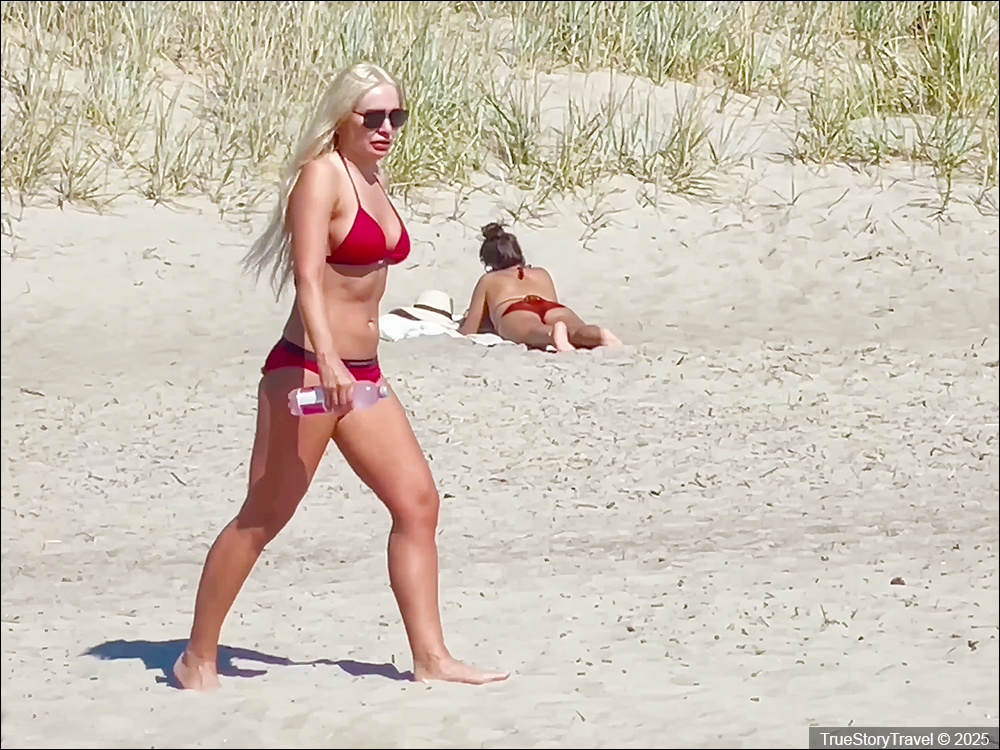 Никаких "леопардовых бикини", тонюсеньких стрингов и прочей "экзотики" - на пляже замечено не было. Для сравнения, на пляжах в Испании - каждая вторая девушка, наоборот - одевалась по принципу "чем меньше одежды - тем лучше".